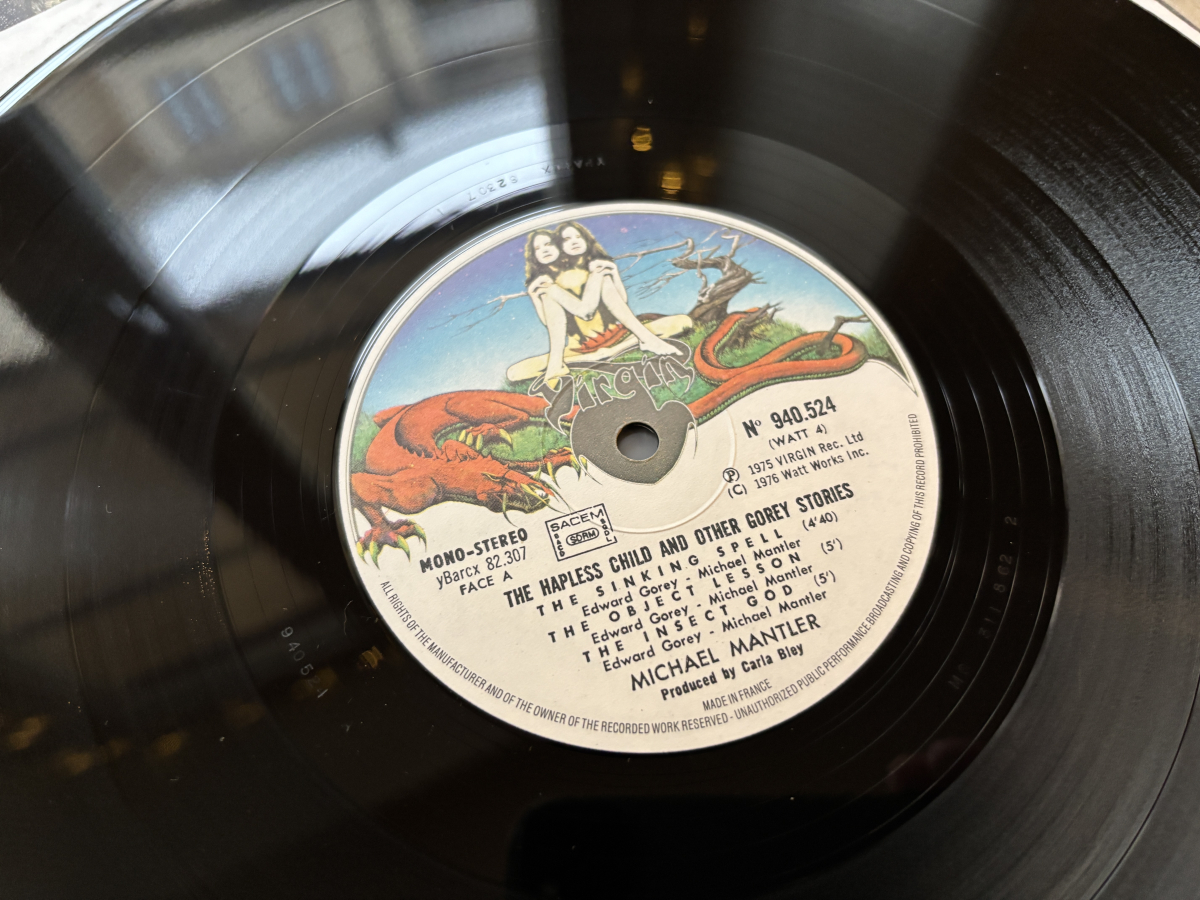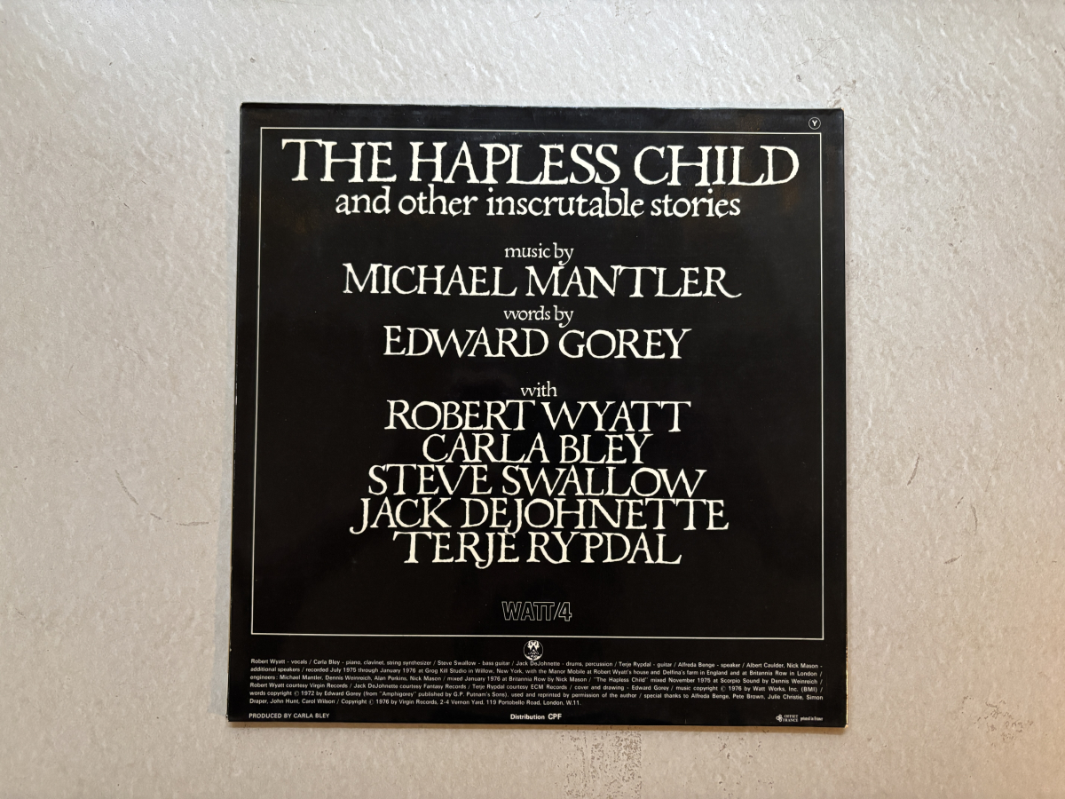 Beautiful 1976 French Virgin pressing of Mantler’s cult collaboration with illustrator Edward Gorey, darkly whimsical chamber-jazz with Robert Wyatt’s unmistakable vocals.